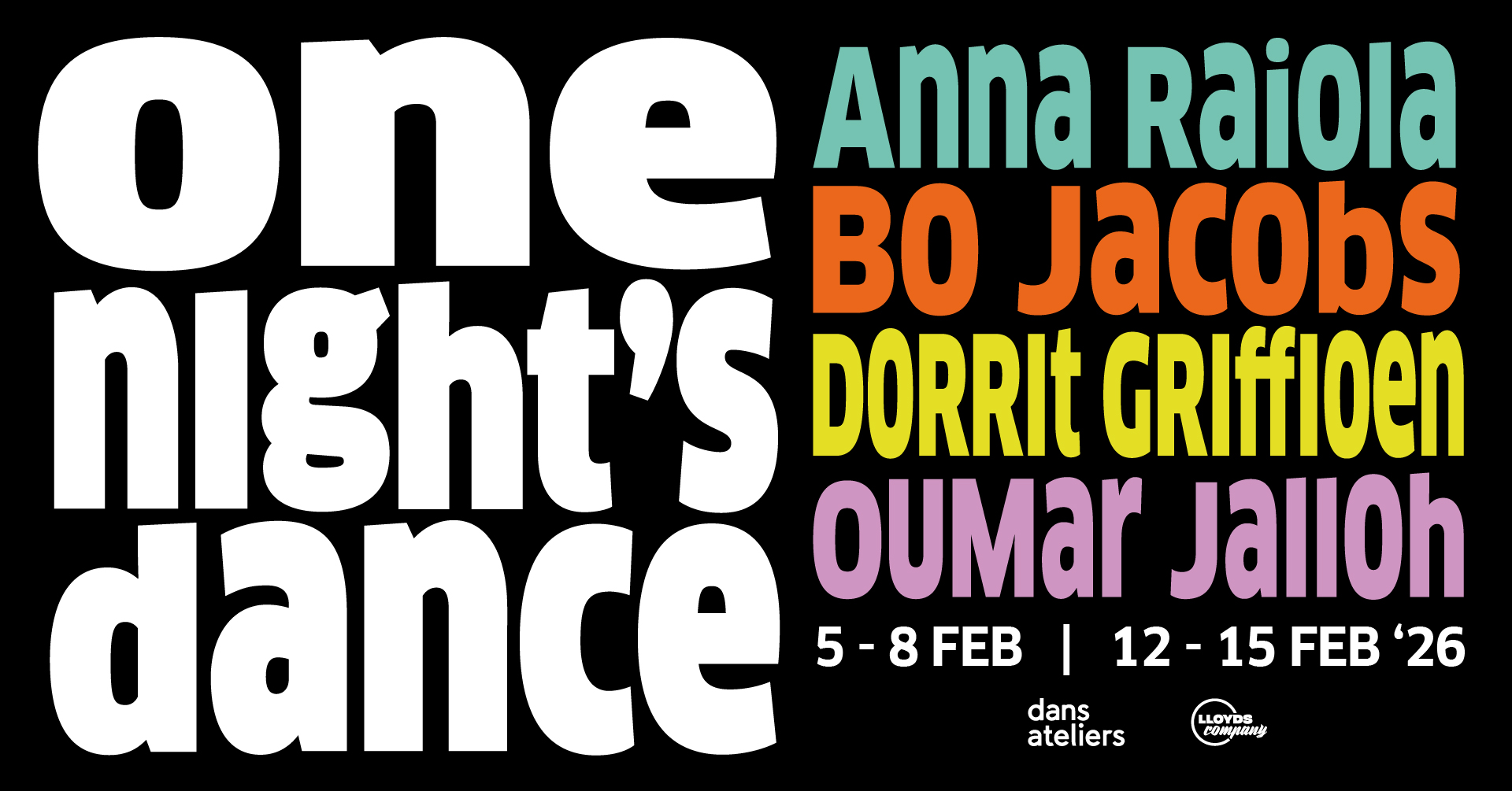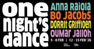 One Night’s Dance is hét jaarlijks talentontwikkelingstraject voor beginnende dansmakers, geproduceerd door Dansateliers in samenwerking met Lloydscompany.
